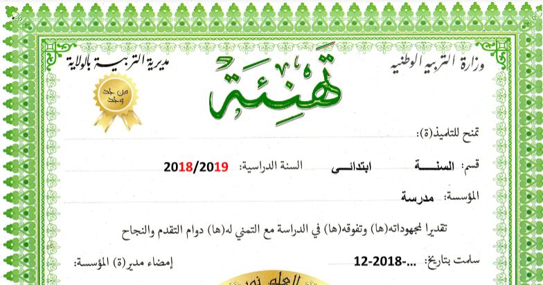 شهادات تقدير وتشجيع للتلاميذ للتحميل بصيغه وورد Word قابلة للتعديل